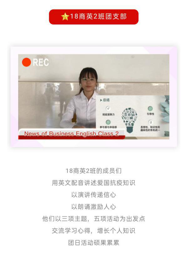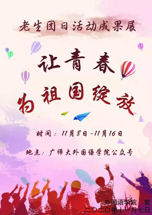 2020年11月8日至11月16日,Beat365正版唯一官网必一成功举办了“让青春为祖国绽放”线上老生团日活动成果展。18、19级共30个团支部参与了团日活动成果展,并在“广师大外国语学院”公众号线上展示活动成果。参加活动的评委有我院分团委书记梁婷老师、辅导员成本长老师、常煜昕老师以及团委副书记和学生会主席团。本次活动旨在引领我院学子深入学习习近平总书记系列重要讲话精神,切实加强团员青年思想政治教育,推进“活力在基层”的基层团建工作,不断提高学生自我教育、管理和服务能力,增强对团组织的认同感及归属感。