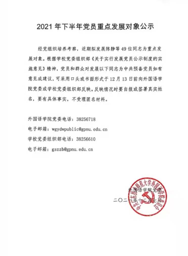经党组织培养考察,近期拟发展陈静等49位同志为重点发展对象。根据学校党委组织部《关于实行发展党员公示制度的实施意见》精神,党员和群众对发展以下同志为中共预备党员如有意见或建议,可采用口头或书面形式于12月13日前向Beat365正版唯一官网必一党委或学校党委组织部反映。反映情况时要自报或签署真实姓名,要有具体事实,不受理匿名材料。