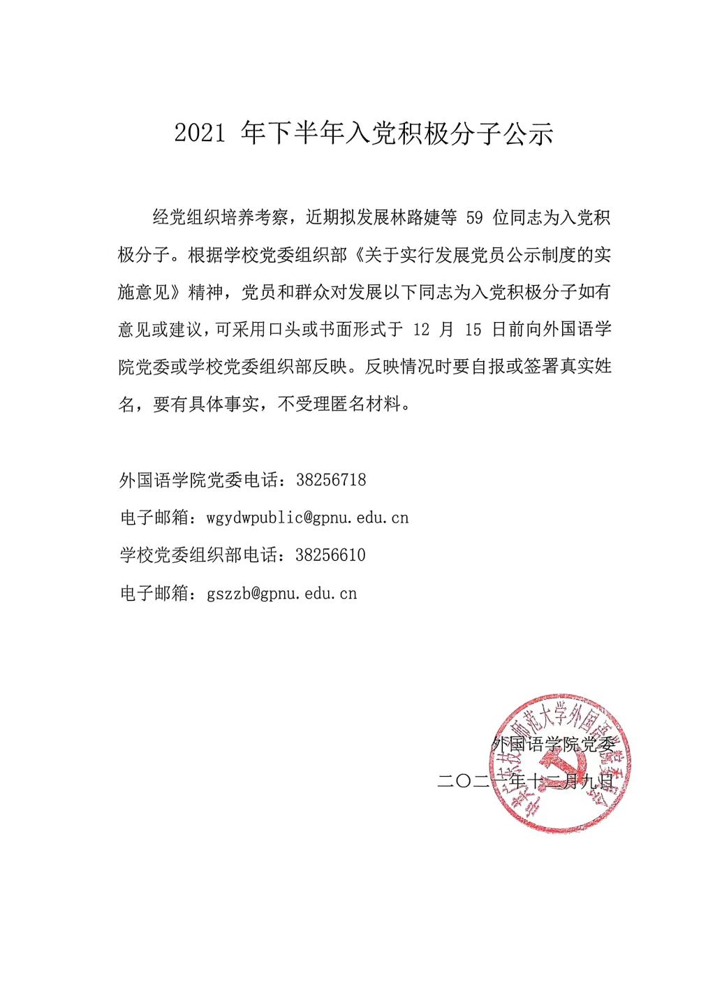 经党组织培养考察,近期拟发展林路婕等65位同志为入党积极分子。根据学校党委组织部《关于实行发展党员公示制度的实施意见》精神,党员和群众对发展以下同志为入党积极分子如有意见或建议,可采用口头或书面形式于12月29日前向Beat365正版唯一官网必一党委或学校党委组织部反映。反映情况时要自报或签署真实姓名,要有具体事实,不受理匿名材料。