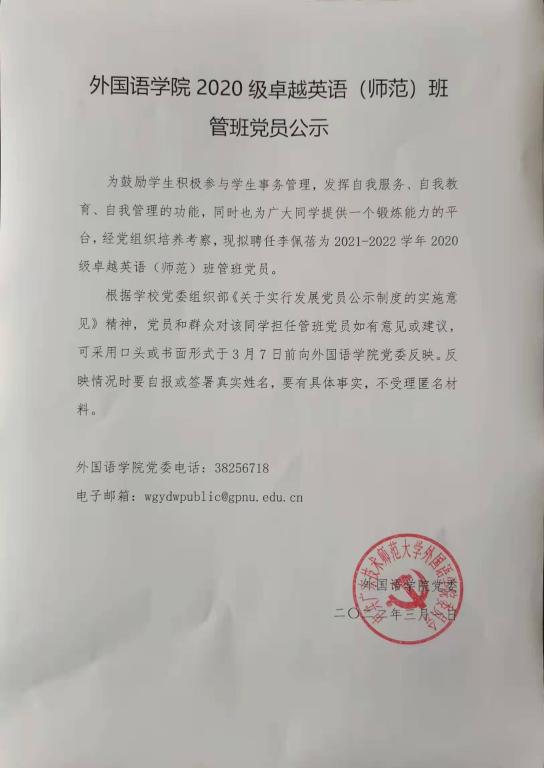 为鼓励学生积极参与学生事务管理,发挥自我服务、自我教育、自我管理的功能,同时也为广大同学提供一个锻炼能力的平台,经党组织培养考察,现拟聘任李佩蓓为2021-2022学年2020级卓越英语(师范)班管班党员。