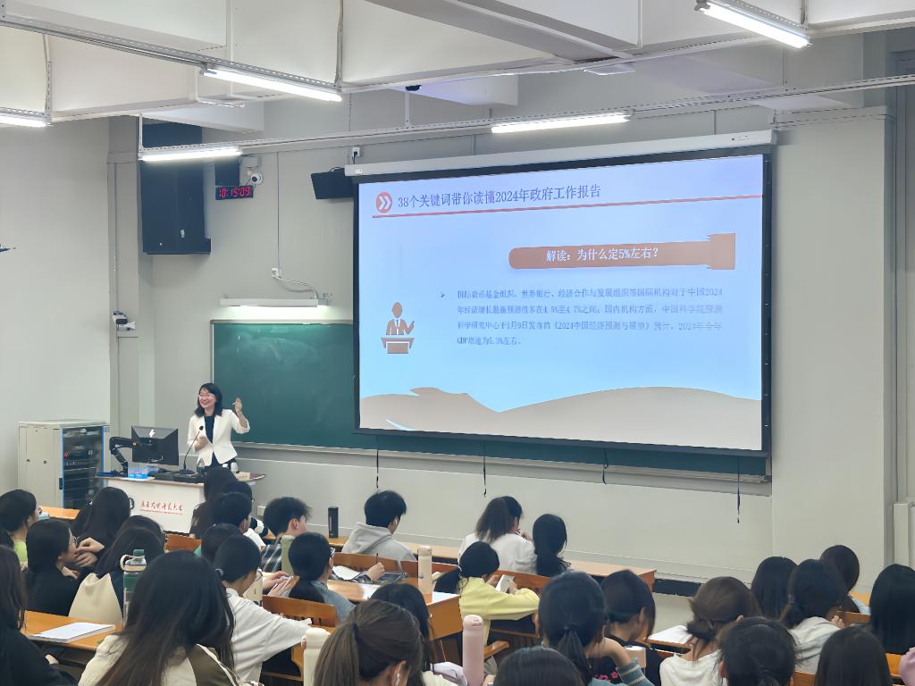 徐玲以《读政府工作报告,悟青年发展未来》为题,围绕政府工作报告中的新质生产力发展、人工智能、国际传播等38个新词热词,带领同学们学习我国关于经济、政治、文化、社会、生态文明等方面的建设与规划,深入浅出地为同学们阐述了新时代新征程的使命任务。