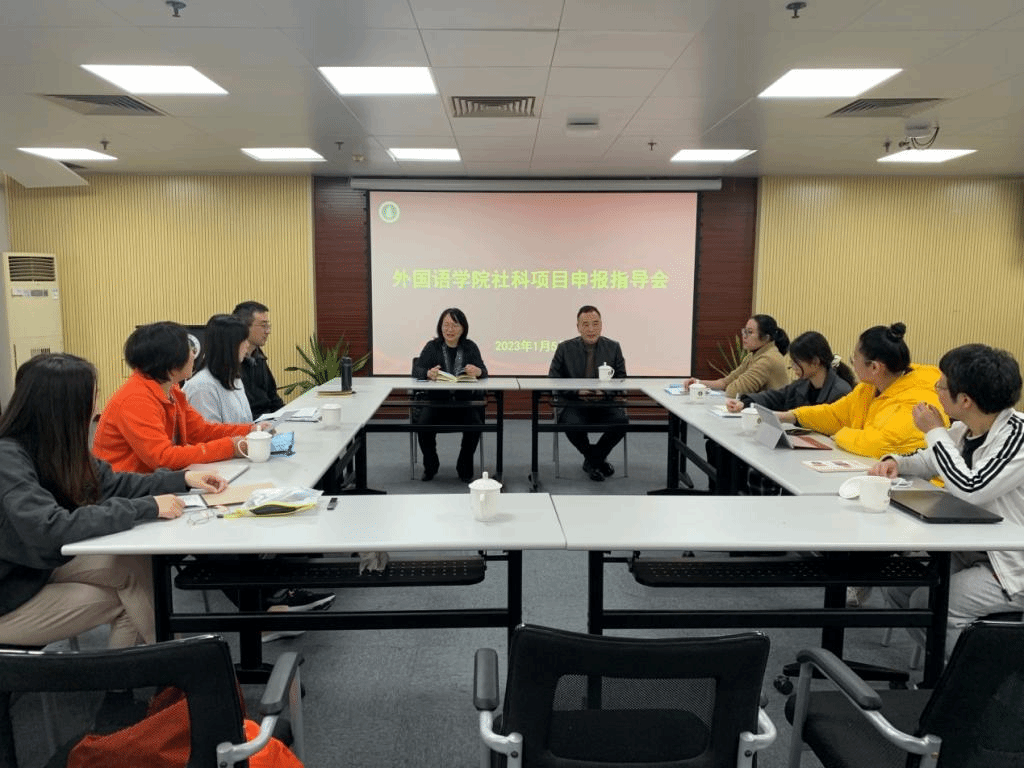 为推进我院社科基金项目申报工作, 2023年1月5日下午,我院举行了社科项目申报指导会。会议特邀广东外语外贸大学高级翻译学院博士生导师、国家社科基金评审专家莫爱屏教授到我院指导。会议由院长徐玲教授主持,陈倩副院长、拟申报项目的老师和我院近三年新进博士参加了本次指导会。