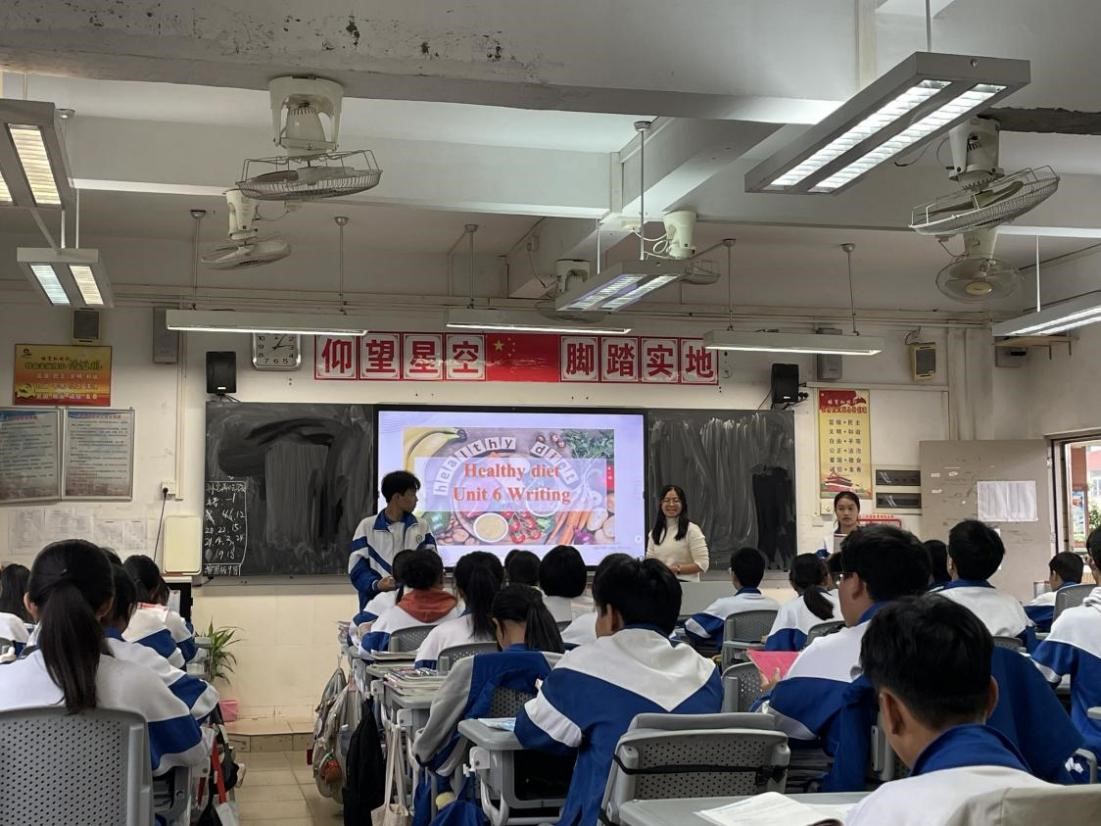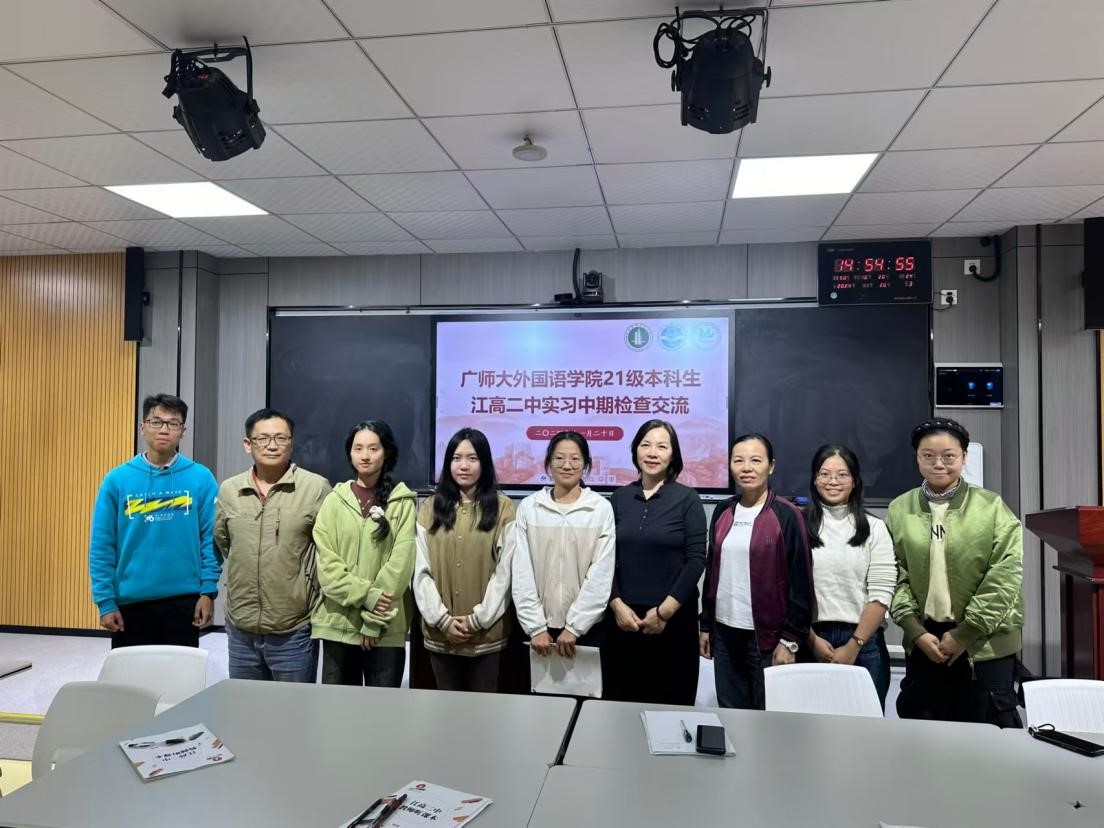 蒋银健老师于11月20日走访了江高二中进行实习教学中期检查,蒋老师先与3位指导老师和8位实习生进行了座谈,随后听评课一节。从整体情况来看,学生工作态度积极、教学认真、团队合作意识强、能够深度融入学校和班级活动,目前都已顺利完成一个单元的英语教学任务。不足之处,主要体现在班级管理和创新教学两方面。针对这些问题,在座谈中,评课老师与同学们都进行了有效沟通。