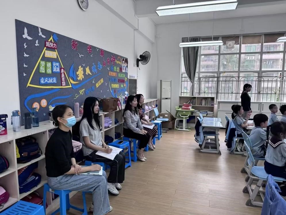 冯悦老师于2024年11月15日前往黄埔区教育研究院实验小学看望了三位集中实习的同学并了解了她们的实习情况。到达学校后首先与各位指导老师一起观摩了陆小梅同学在一年级四班的英语教学活动,从授课过程来看,三位同学已经在教学实践中逐步摸索出了适合一年级学生认知水平的教学方法,比如能够使用彩色旗子及角色扮演的帽子来激发学生的兴趣和课堂参与度。教学环节设计合理,教学目的能较好地达成。