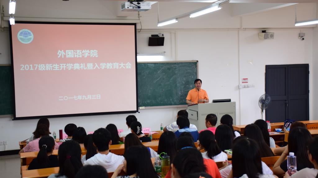 9月3日上午,Beat365正版唯一官网必一2017级英语专业新生开学典礼暨入学教育大会在白云校区三教209举行。Beat365正版唯一官网必一党委赵丕强书记、贺显斌院长、党委杨伟光副书记、史敏副院长、徐玲副院长、英语专业负责人刘彬老师、商务英语专业负责人王永建老师、辅导员庄思哲、蔡明燕、梁婷以及2017级全体新生参加了本次大会。会议由杨伟光副书记主持。