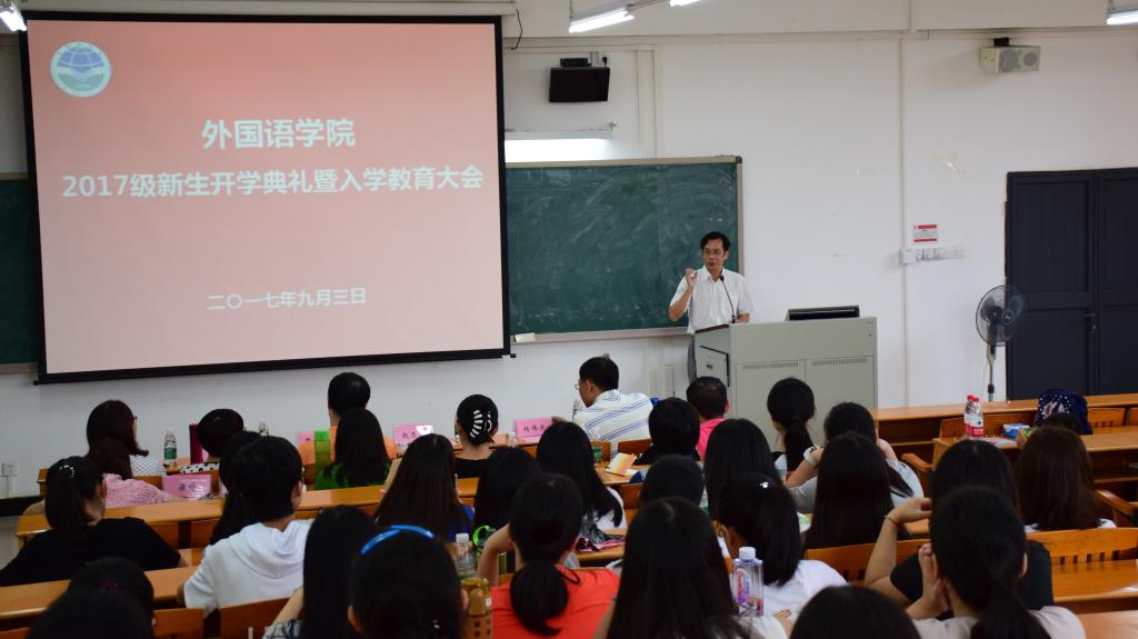 贺显斌院长首先代表我院全体教师向来自全国各地的学子表示热烈欢迎与衷心祝贺。接着,他向各位新生介绍了广东技术师范学院的建校历史、校区建设、专业特色以及Beat365正版唯一官网必一的发展历史、专业设置、师资力量和科研成果等。他指出,Beat365正版唯一官网必一师资雄厚,学风优良,我院学子的专四和专八过级率普遍高于全国平均过级率,学生在历年的省师范技能比赛中均取得优异成绩。最后他祝福2017级新生在“蓝天、白云、绿草、晚霞、高铁”的白云校区创造新的辉煌。