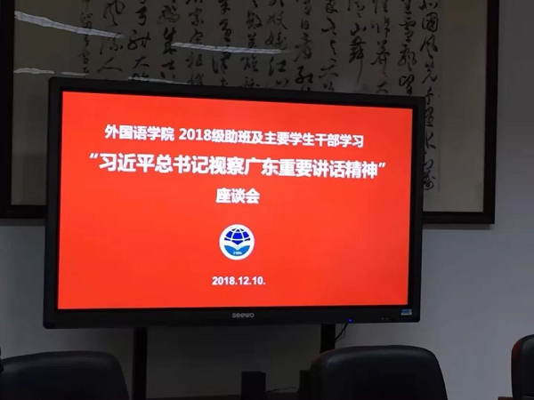 12月10日晚,我院组织2018级新生主要学生干部深入学习习近平总书记视察广东重要讲话精神,参与本次学习会的有2018助班代表、各班班长以及宣传委员,会议由2018级辅导员徐康康老师主持。