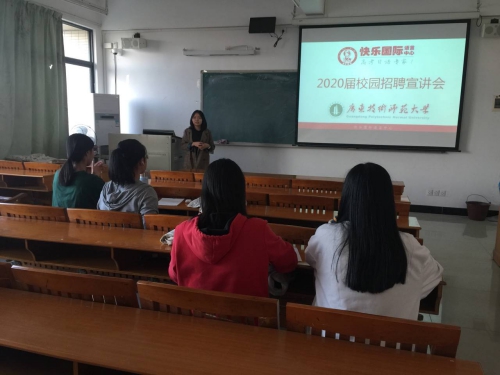 为深入做好我院2020届毕业生的就业推荐工作,积极为我院毕业生就业做好服务工作,2019年11月20日,我院邀请了广州华莘天培教育科技有限公司旗下快乐国际语言中心机构在白云校区三教516课室举办专场招聘宣讲会。与会人员有快乐国际语言中心机构人事专员刘老师以及我院部分毕业生。