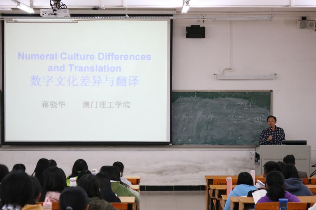 讲座中,蒋骁华教授以翻译与文化的关系为切入点,介绍了不同的文化如何影响翻译的方式;接着以大量生动有趣的例子形象地说明了中国与西方国家对不同数字理解上的差异,还用包含数字的句子指出其中“数字是实,意义为虚”的文化内涵,对单词的表达高级与否如何受到不同文化的影响作了重点介绍。在讲座中,蒋教授提到,中国古典文学作品中虚指数字的翻译方式传达了一种东方情调,体现了中国翻译学者对数字文化的深刻见解。最后,蒋教授对讲座作了总结,他指出数字文化属于语言文化,也属于社会文化,了解这些数字文化对我们的学习和翻译大有裨益。