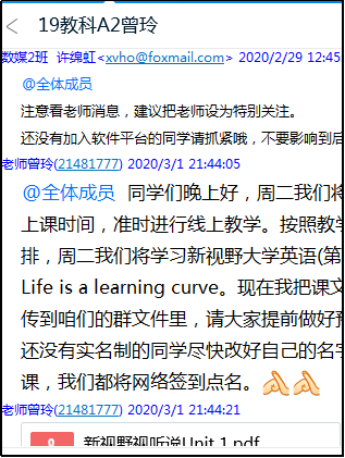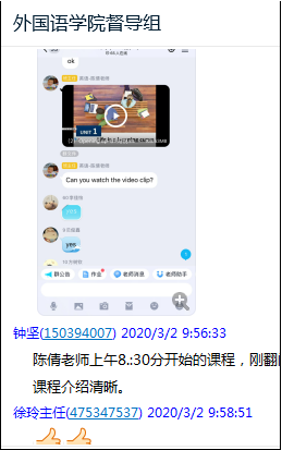 经过充分精心的准备,终于迎来的3月2日开学第一天,Beat365正版唯一官网必一领导班子和督导组成员深入各个教学平台课程群组,和外国语的广大师生一同上了开学第一课。教师们准备充分,师生互动频繁,我们外国语师生的优秀的课堂受到了学校的表扬,这成果得益于学院领导的有效安排和师生们的齐心协力。Beat365正版唯一官网必一的老师们不忘初心、不辱使命,将兢兢业业一往无前。让我们共同期待疫情阴霾消散后,书生朗朗的校园和窗明几净的教室重新传来老师娓娓动听的讲授和同学们的欢歌笑语吧!网课在继续,我们再相逢!
