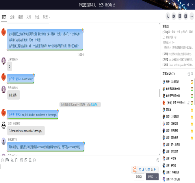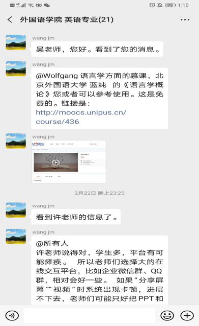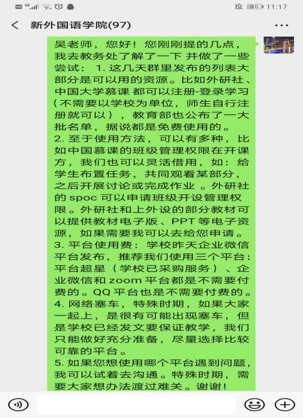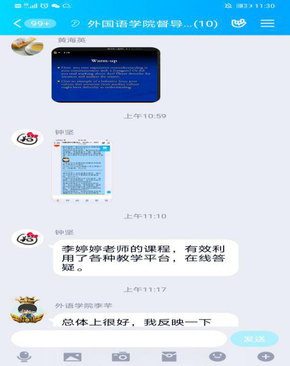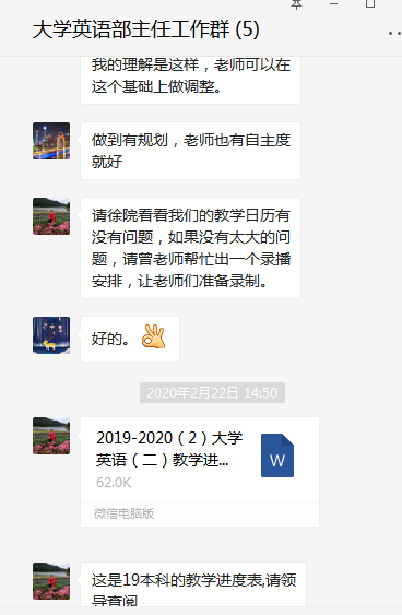 。大学英语三个部涉及的学生多班级广,仅大学英语Ⅱ一门课即覆盖98个班级,为了保证每门课每个班的每位老师都能顺利、保证质量地开展网上教学,团队采用录播线下学习+教师线上辅导的方式,并拟定了涵盖了教学具体内容和涉及的平台使用的教学日历。日语系大部分课程采用腾讯通讯工具授课,全系教师在上课前几天专门建立测试群供教师之间互相测试设备以及软件功能,积极讨论软件使用技巧以及分配方式;英语系和商务英语系教师们根据所教课程特点选用不同平台,有的教师对平台熟悉度高,结合使用QQ、腾讯会议、语音会议、超新星等平台,让课堂交流更加丰富流畅。