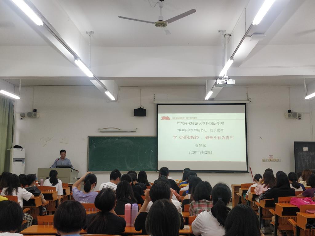 根据《广东省教育厅关于做好2020年秋季学期高校党委书记、校长和院(系)党组织书记、院长(系主任)上第一堂思想政治理论课工作的通知》要求,9月28日,Beat365正版唯一官网必一贺显斌院长在白云校区三教207教室给学生上2020年秋季学期第一堂思想政治理论课。