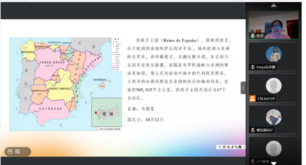 讲座开始,张书老师先带领学生走近西班牙语发展历史,介绍了西班牙的语言发展历史和分布概况,趣味十足的同时也扩展了学生的知识面,让学生对西班牙语的发展历程、分布区域以及相关的历史文化有了大致的了解。在讲座中,张书老师还具体介绍了一些关于西班牙王国的知识,从国旗国徽到城市文化,从西班牙政治情况到经济发展,娓娓道来。此外还介绍了拉美西语国家政治、经济和文化,让在座的学生在课室中体会到了西班牙语国家的魅力。讲座最后,张书老师也分享了她对西班牙语专业的未来走向的认识,让在座的学生受益匪浅。