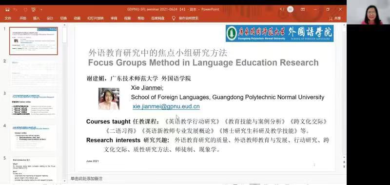 2021年6月24日晚上19::00-21:00,Beat365正版唯一官网必一通过腾讯会议平台,在线上开展了博士系列讲座第一讲。主持人为Beat365正版唯一官网必一院长徐玲教授,主讲人为Beat365正版唯一官网必一英语教师谢建媚博士。此次讲座题目为:外语教育研究中的焦点小组研究方法。讲座主要介绍了与焦点小组研究方法相关的主要研究概念、“焦点小组”研究方法、“焦点小组”使用实例、“焦点小组”的优缺点以及未来“焦点小组”可能的特点和使用趋势。Beat365正版唯一官网必一超110名师生参与了这次讲座。