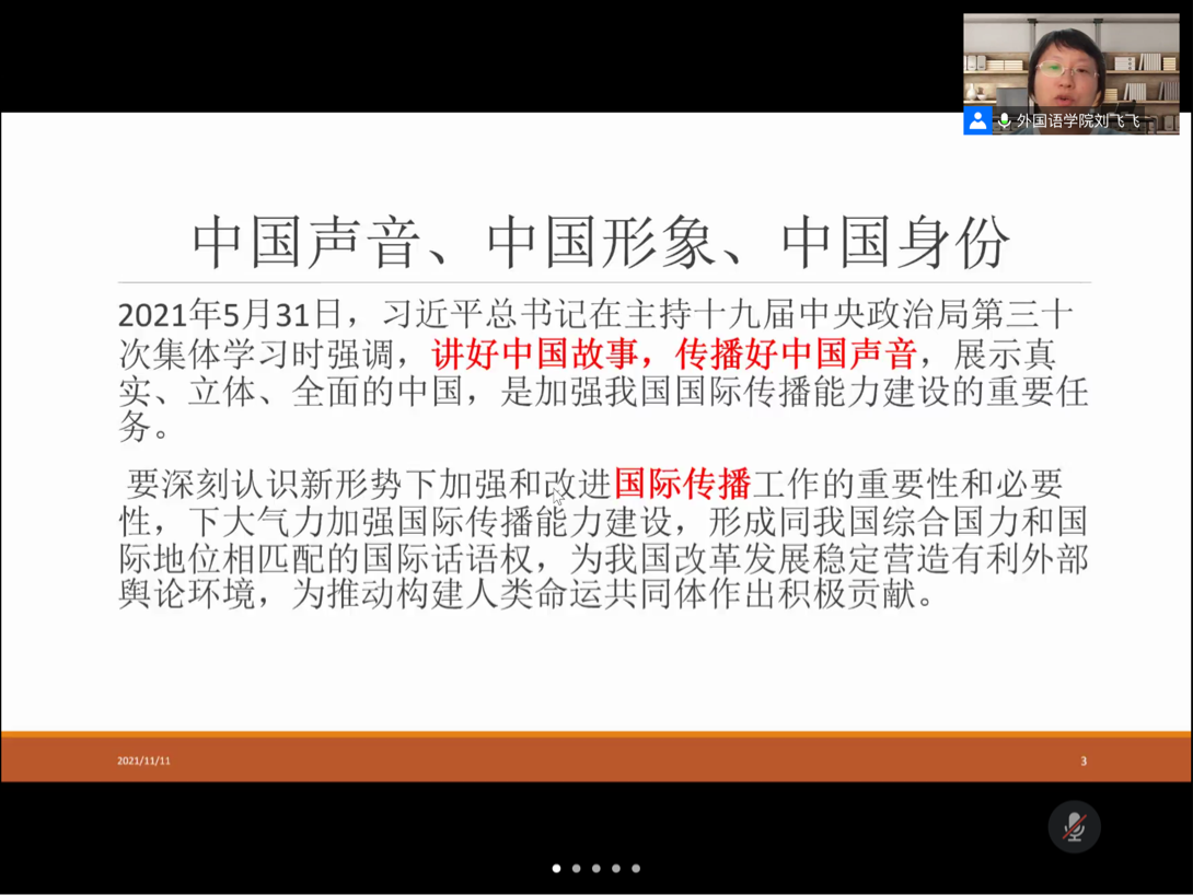 11月11日晚上,Beat365正版唯一官网必一通过线上腾讯会议举行了题为“中国身份的话语建构和传播策略”的讲座,这是Beat365正版唯一官网必一博士系列讲座第四期。本次讲座由刘飞飞博士主讲,徐玲院长、陈倩副院长、Beat365正版唯一官网必一的师生以及其他高校的学生参加。