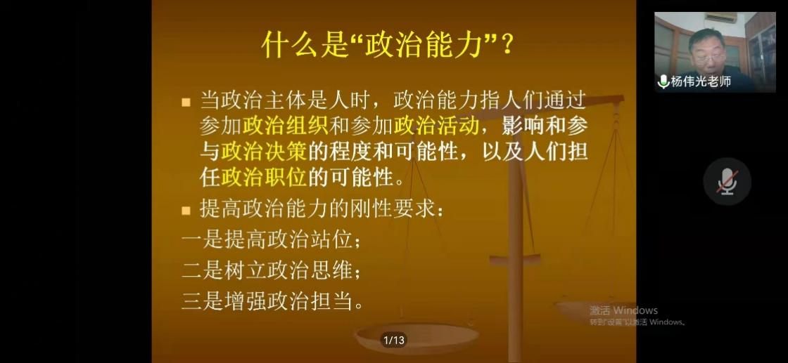 杨伟光书记以“加强政治建设,培养政治能力”为主题,首先教育学生要认真学习和领会十九届六中全会重要讲话精神,要深刻认识党的百年奋斗的初心使命和重大成就,深刻认识中国特色社会主义新时代的历史性成就和历史性变革,深刻认识党的百年奋斗的历史意义和历史经验,深刻认识以史为鉴、开创未来的重要要求,从党的百年奋斗历程中汲取智慧和力量,不断增强做中国人的志气、骨气、底气。