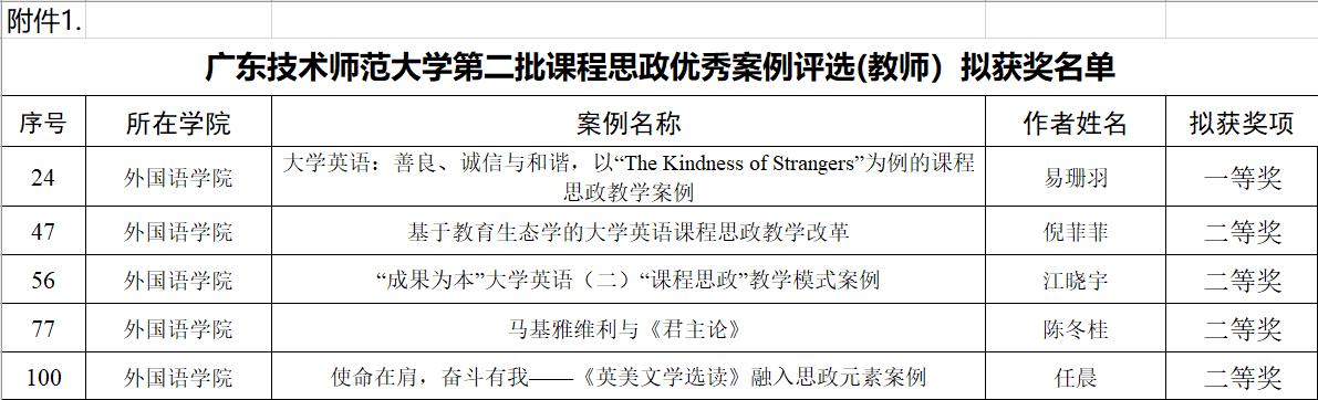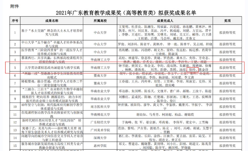 1. Beat365正版唯一官网必一徐玲教授参与的项目《大学英语课程思政内涵建设与实践成果》获2021广东省教育教学成果奖省级特等奖。