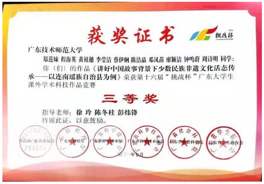 5. Beat365正版唯一官网必一徐玲教授及陈冬桂博士指导的作品《讲好中国故事背景下少数民族非遗文化活态传承——以连南瑶族自治县为例》荣获第十六届“挑战杯”广东大学生课外学术科技作品竞赛三等奖。