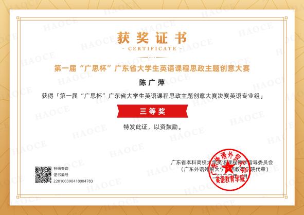 6. 2021年首届“广思杯”广东省大学生“学外语,讲党史,强自信,勇担当”主题创意大赛暨首届“广思杯”广东省英语思政创意大赛中,Beat365正版唯一官网必一团队指导的欧忠林同学及陈广萍同学分别获得英语组二等奖和三等奖,梁婉怡同学获得非英语组三等奖,Beat365官网获得优秀组织奖。