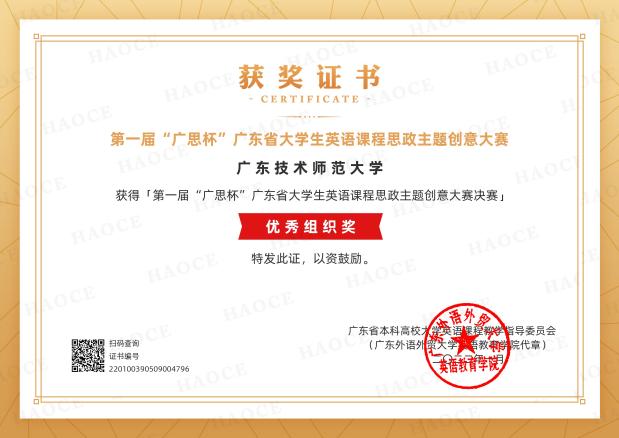 Beat365正版唯一官网必一在2021年至今高度重视课程思政建设的系列努力,取得了令人欣慰的成果,获得思政教育教学相关的广东省级思政改革建设项目和思政优秀案例以及校级课程思政优秀案例等多项思政建设领域的立项和奖项,获得2项思政主题学科竞赛省级奖项,并在广东省英语思政创意大赛“广思杯”中获得优秀组织奖: