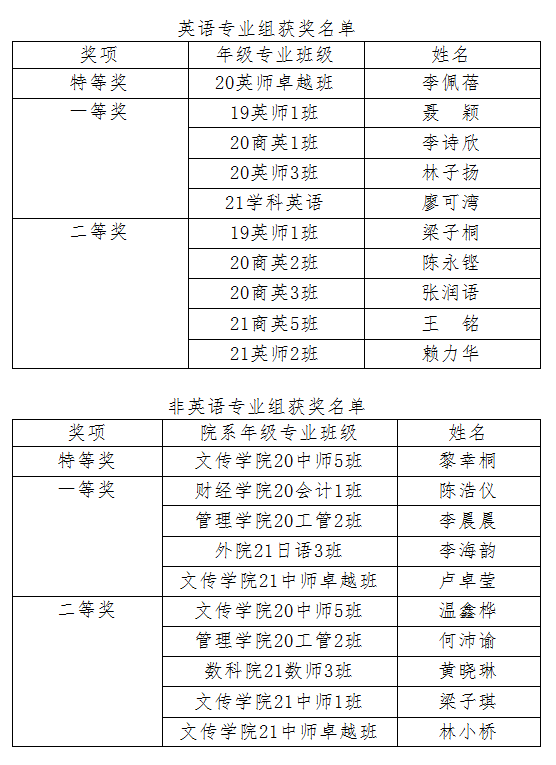 英语专业组特等奖获得者:20英师卓越班李佩蓓
