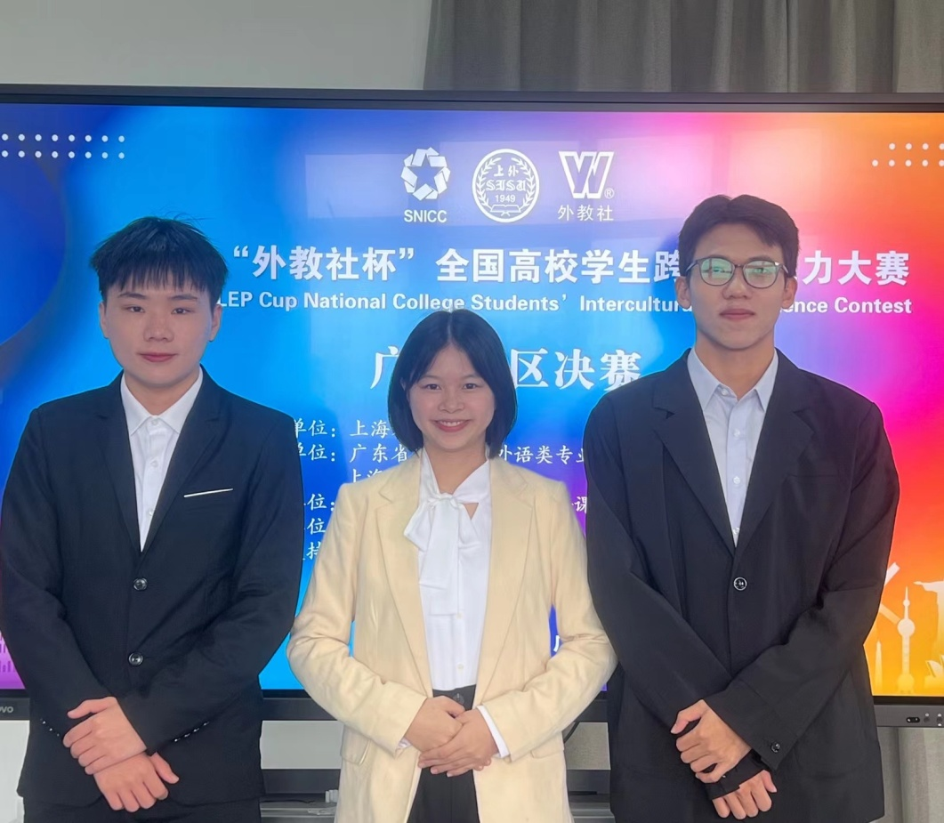 12月4日,由广东省本科高校外语类专业教学指导委员会、上海外语教育出版社主办,广东工业大学承办的第五届“外教社杯”全国高校学生跨文化能力大赛广东赛区决赛落下帷幕。Beat365官网学生林斌(Beat365正版唯一官网必一)、黎幸桐(文学与传媒学院)、温鑫桦(文学与传媒学院)(指导老师:李逸涵)获二等奖的好成绩。