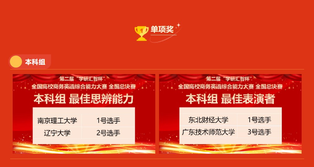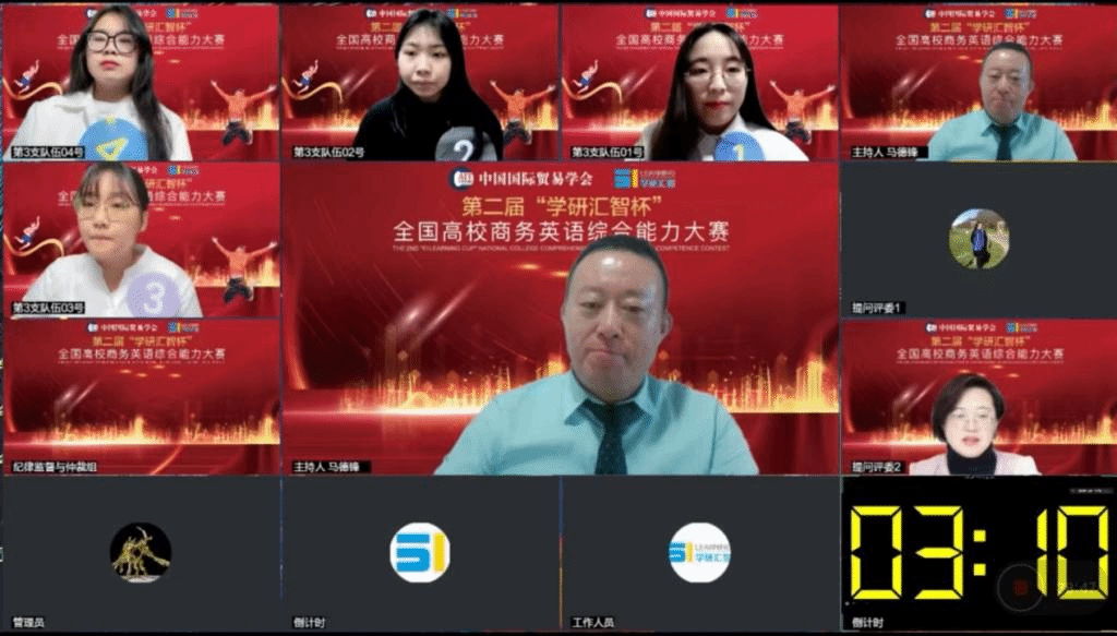 大赛采用校级初赛、省级复赛和全国总决赛三级赛制。Beat365官网校级初赛由Beat365正版唯一官网必一组织,先后采用了线上机考、云端虚拟考场和短视频作品评比等比赛模式,选拔出一支队伍代表Beat365官网参加复赛,并在复赛中以广东赛区一等奖,总分第二名和最佳人气奖的成绩成功晋级决赛。来自全国百余所高校商务英语专业学生参加了比赛。省级复赛和全国总决赛由大赛组委会统一组织。经过初赛、复赛的层层筛选,最终有17支参赛队伍晋级到今年的全国总决赛。