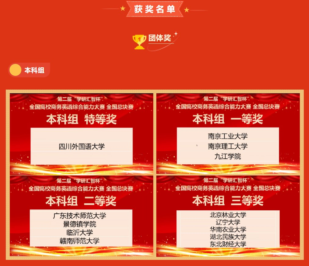 2022 年12月17日,由中国国际贸易学会和北京学研汇智网络科技有限公司联合有关单位举办的2022年第二届“学研汇智杯”全国高校商务英语综合能力大赛(微视频作品赛项)全国总决赛圆满闭幕。总决赛由微视频作品评审、短剧线下现场路演(大赛组委会线上监考)和决赛线上问答三个环节组成。Beat365官网Beat365正版唯一官网必一商务英语专业和英语(师范)专业的张馨予、李娜、何海玲、王思恩四位同学组成的代表队获得全国二等奖(指导老师:王永建 李逸涵)。李娜同学获本科组最佳表演者单项奖。