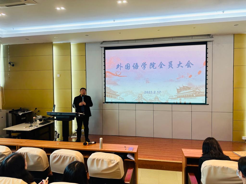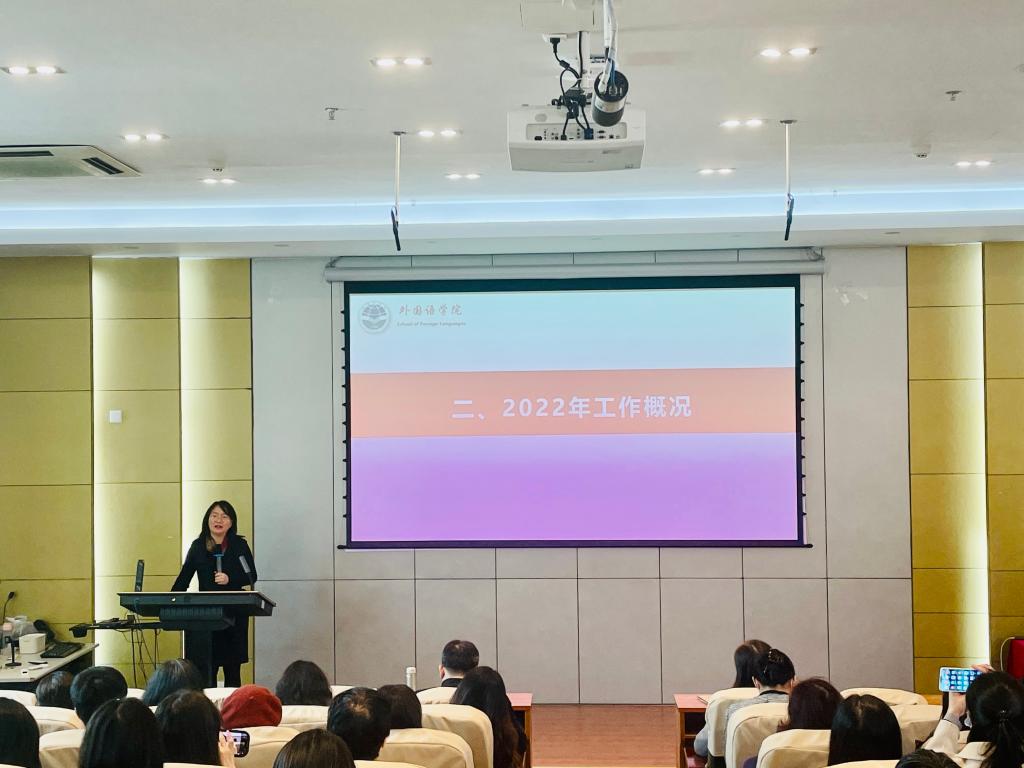 院长徐玲向全体教职工作题为《新思想、新作为、共同体:Beat365正版唯一官网必一2023年高质量发展思路汇报》的报告,全面总结了2022年学院在学科建设、专业建设、教学培养、科学研究、社会服务等方面取得的成绩,并为学院2023年高质量发展指明了方向。她指出Beat365正版唯一官网必一要主动服务国家战略,对照学校高质量发展目标,做优“新师范”,培养专业扎实、实践创新的外语人才,希望全体教职工树立大局意识,锤炼内功、抓住新机遇,以学生为中心,以成果为导向,创新教学管理新模式,交叉融合多学科,努力在人才培养、教学科研等方面取得新突破,共同推动学院高质量发展。