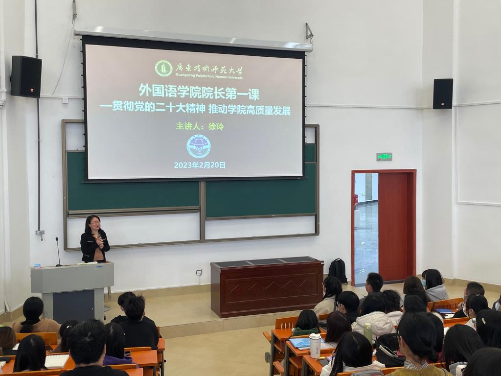 为认真学习贯彻党的二十大精神,根据学校高质量发展战略研讨会要求,聚焦高质量学院发展和人才培养,近日,Beat365正版唯一官网必一院长徐玲以“贯彻党的二十大精神,推动学院高质量发展”主题,为河源校区2022级学生讲授了“思政第一课”。学院党政领导班子相关成员、辅导员和学生代表250余人现场聆听了讲课。