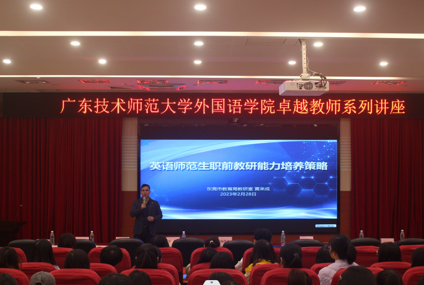 开班仪式后,校外导师代表——广东省基础外语教育研究工作室专家、东莞市高中英语教研员黄来成老师为卓越班学生以及22级研究生讲授题为“英语师范生教研能力培养策略”的卓越教师系列讲座,讲座中师生积极互动,同学们反响热烈,受益匪浅。