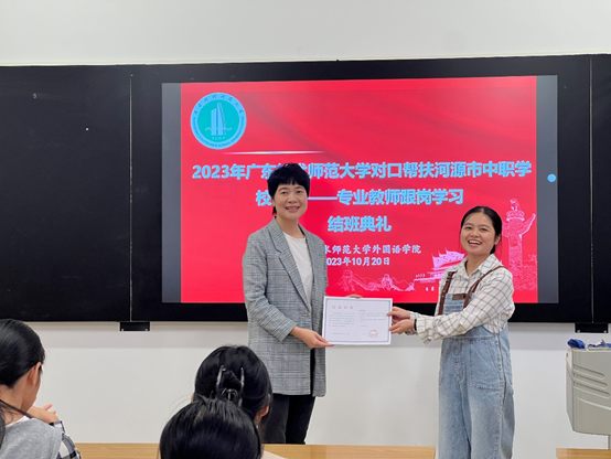 Beat365正版唯一官网必一于2023年10月20日上午在河源校区唯实301举行了2023年Beat365正版唯一官网必一对口帮扶河源市中职学校项目——专业教师跟岗学习结业典礼。导师江晓宇、3位河源常驻教师代表、东源卫生职业技术学校派出的跟岗教师林园子及Beat365正版唯一官网必一2023级商英5班的学生参加了仪式。