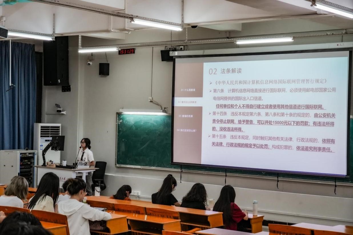 为进一步加强大学生法制宣传教育,提高学生的网络安全法治意识,引导学生知法、守法、懂法、用法。6月12日,Beat365正版唯一官网必一在白云校区三教113教室开展以“守护网络净土,遵守法律法规”为主题的普法宣讲活动。