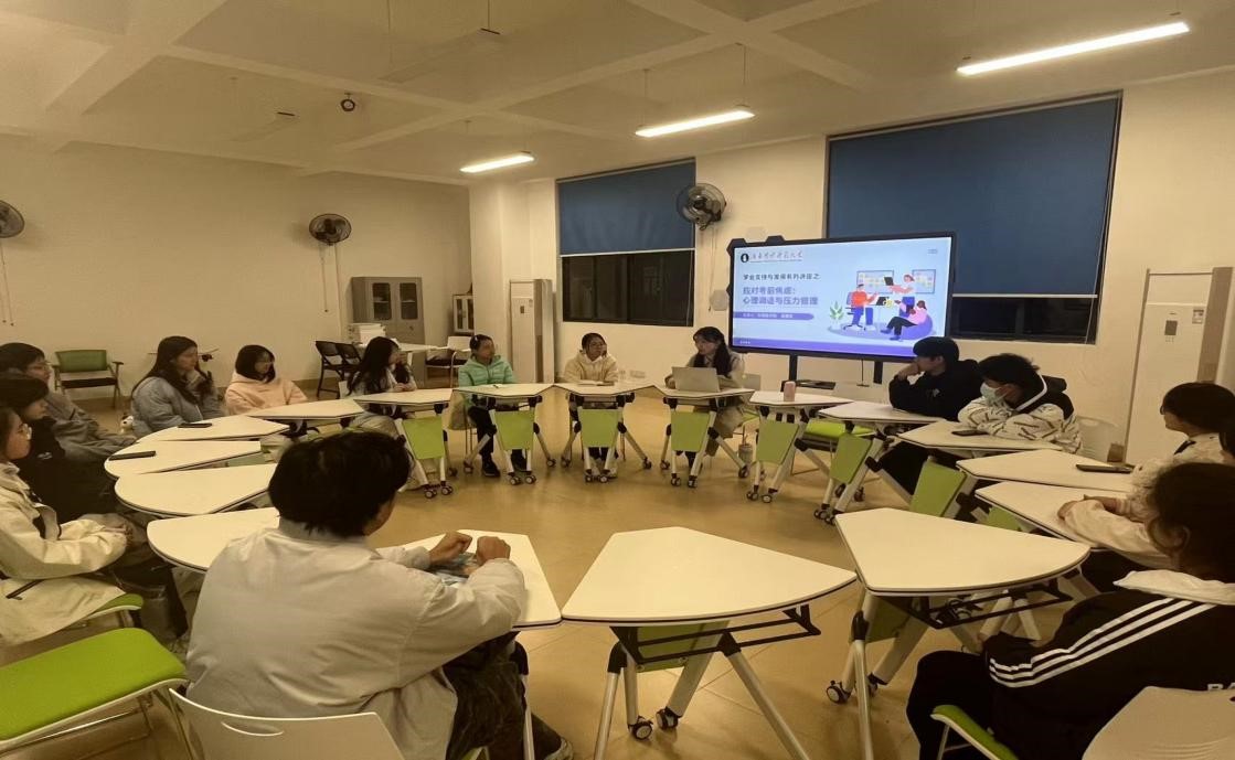 接着,在应对考前焦虑方面,唐慧玲老师强调了学生们要如何认识和接受焦虑情绪,介绍了科学的心理状态管理方法,鼓励学生们积极参与体育锻炼,注意冬季保暖,以良好身心状态迎接考试。最后,在自由交流环节,两位老师对仍有疑问的学生进行了逐一解答,确保每位同学都能获得所需的学习指导和心理支持。