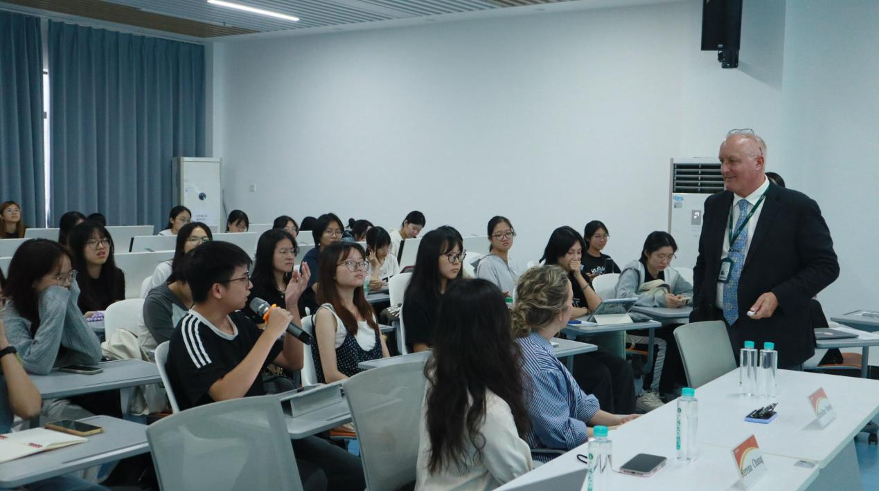 Mullen博士在讲座中期待通过两校共建实习基地,共同培养两校学生的人文素养与思辨能力,让他们在未来无论身处何地,都能从容应对,融通自在。现场互动环节中,学生积极提问,与Mullen博士进行了更深入的交流和探讨。