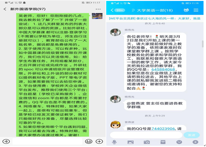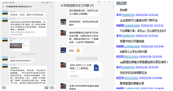 除了在云平台建课,老师们采取多种手段为同学们准备了视频、电子教材等丰富实用的材料,同时,通过问卷、投票等方式及时了解学生的在线学习困难和诉求,通过统计等功能实时掌握学生学习情况。大学英语三个部涉及的学生多班级广,仅大学英语Ⅱ一门课即覆盖98个班级,为了保证每门课每个班的每位老师都能顺利、保证质量地开展网上教学,团队采用录播线下学习+教师线上辅导的方式,并拟定了涵盖了教学具体内容和涉及的平台使用的教学日历。日语系大部分课程采用腾讯通讯工具授课,全系教师在上课前几天专门建立测试群供教师之间互相测试设备以及软件功能,积极讨论软件使用技巧以及分配方式;英语系和商务英语系教师们根据所教课程特点选用不同平台,有的教师对平台熟悉度高,结合使用QQ、腾讯会议、语音会议、超新星等平台,让课堂交流更加丰富流畅。
