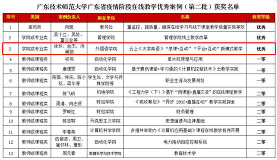 我院不断鼓励和引导教学团队和教师队伍提高教学质量,打造线上金课。在我院多门课程作为优秀教学案例在学校得到推广的同时,其中的《云上《大学英语》“录课+互动“平台+互动”新教学模式》在线教学优秀案例还在众多优秀案例中脱颖而出获得了学院或专业类优秀奖。大学英语线上课程结合传统教学规律和网络教学特点,通过“提前精心录课,课上积极互动”“借助平台功能利用文字语音图像以及视频等方式促进课堂互动”等模式,进一步了实现了翻转课堂在英语课堂上新发展,借力网络创造学生爱学会学的英语课堂。