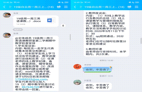 学生教学信息员能够及时反馈给教师信息,提出突出问题协助教师完善课堂;学院各个教研室群内教师之间也保持在线备课等交流活动;学院领导班子和教学督导团队继续进群听课,了解反馈在线教学情况,及时反馈沟通课堂信息。学院对于教学、课堂的质量进行多层次多角度的把控。