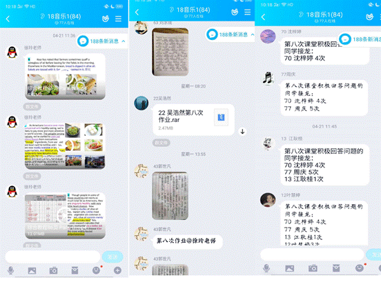 图5徐玲老师在18音乐1班提前发布录课内容、学生拍照提交手写作业以及统计学生上课回答问题次数