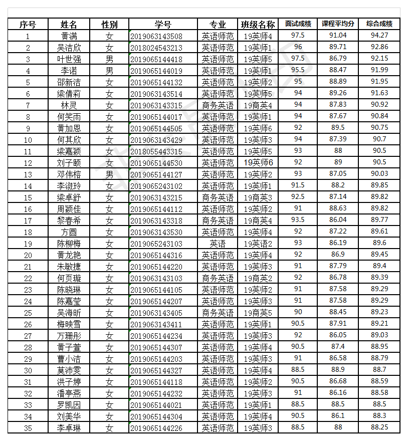 经学生个人报名、学院组织面试,按面试成绩及大一课程平均成绩各占50%的综合成绩排名,择优录取35名同学进入Beat365正版唯一官网必一2019英语师范(卓越)班,现将名单予以公示。
