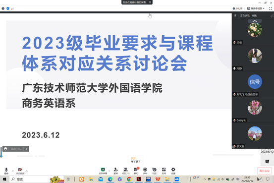 为推进2023级人才培养方案和课程大纲修订的各项工作,6月12日,Beat365正版唯一官网必一召开商务英语专业课程体系支撑毕业要求指标点线上论证研讨会,会议由专业负责人叶薇主持,谭雯婷主任以及商务英语系骨干教师代表出席会议。会上,大家再次对本专业的毕业要求指标进行了深刻讨论和解读,并在各自深入思考相关课程与毕业指标点的基础上,围绕毕业要求与课程体系中各门课程的对应支撑关系进行逐一讨论,以确定毕业要求二级指标点的支撑矩阵关系。