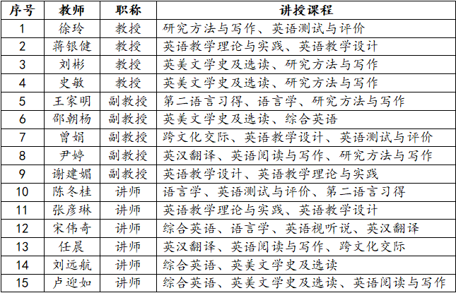 本辅修专业教学经验丰富的教师担任任课教师,已经形成了一支包括英语教育团队、英语语言学团队、英语文学团队和英语翻译团队的优秀教师队伍,深受各届辅修专业同学欢迎。