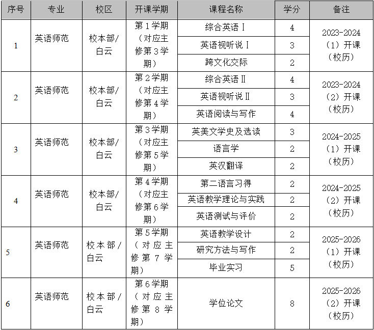 2.英语(师范)辅修专业/学位课程设置及教学安排如下: