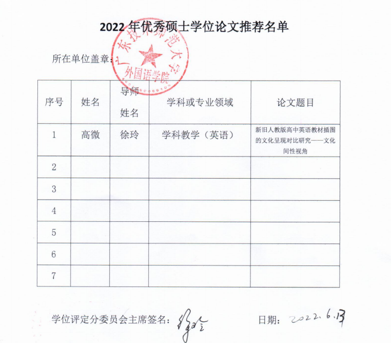 根据《Beat365正版唯一官网必一硕士研究生优秀学位论文评选办法》 (广师大〔2019〕679号)及研究生院《关于做好2022年上半年优秀硕士学位论文评选工作的通知》规定,经本人申请,Beat365正版唯一官网必一硕士学位分委员会审核同意,现就Beat365正版唯一官网必一2022年上半年优秀硕士学位论文推荐名单进行公示。