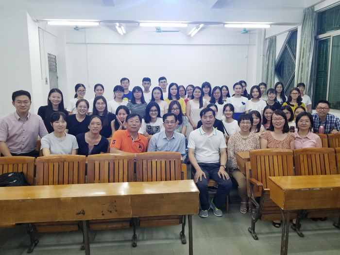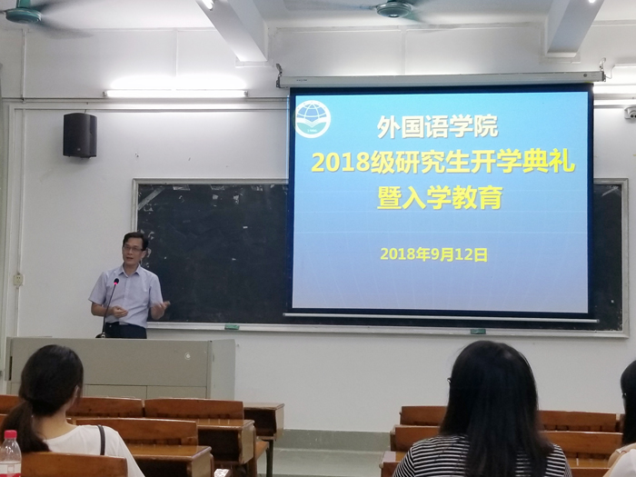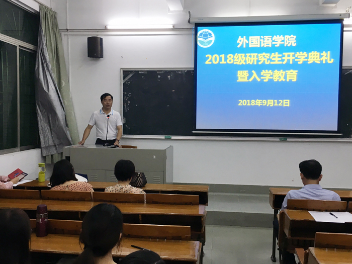 2018年9月12日,Beat365正版唯一官网必一2018级研究生开学典礼在校本部一教106课室举行。Beat365正版唯一官网必一党委赵丕强书记、贺显斌院长、杨伟光副书记、史敏副院长、徐玲副院长、邵朝阳副院长、研究生导师代表余娟老师、辅导员李峰老师、研究生教学秘书黄海英老师以及36名研究生新生出席了开学典礼。大会由邵朝杨副院长主持。