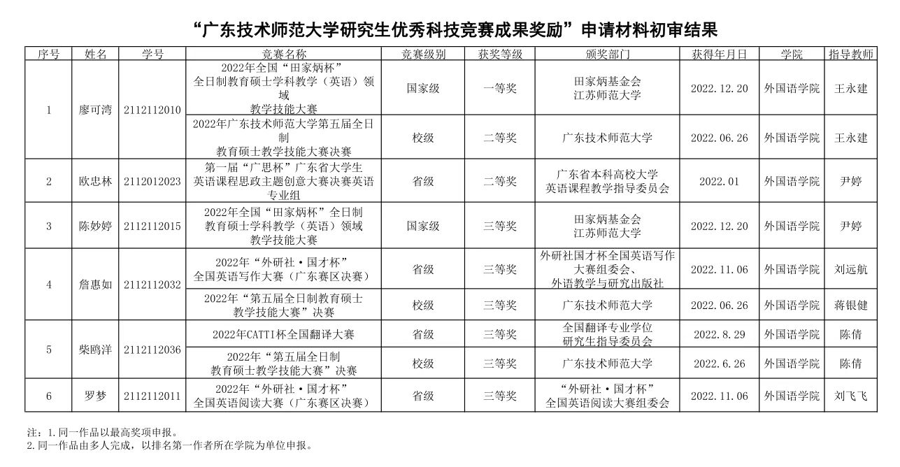 根据“2022年Beat365正版唯一官网必一研究生优秀科技竞赛成果奖评选工作通知”和《Beat365正版唯一官网必一研究生学科竞赛资助和奖励办法》(广师大〔2022〕372号)相关规定,学院组织对学生的申报材料进行初步评审,现将结果公示如下。
