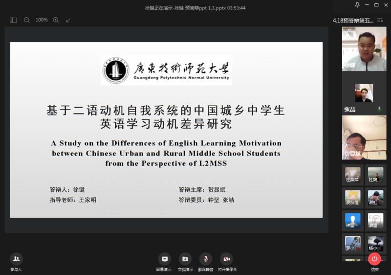 为全面贯彻落实教育部和学校关于疫情防控期间的研究生学位授予相关工作要求,Beat365正版唯一官网必一采取多种措施加强研究生毕业论文指导,切实保障论文质量,并于2020年4月18日成功举行研究生毕业论文线上预答辩。