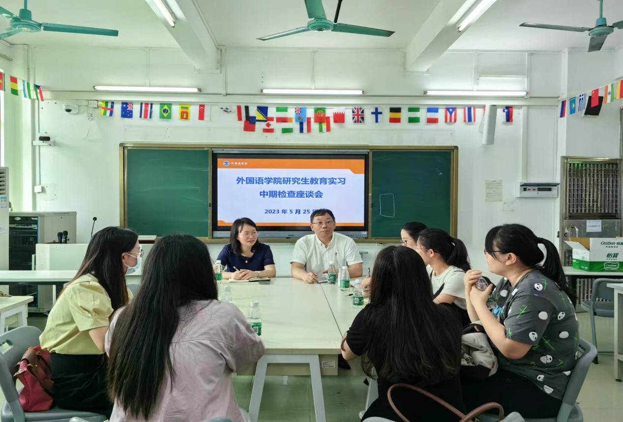 此后,学院领导还与在天河外国语学校和广州一一三中学实习的研究生召开了座谈会。徐玲院长亲切地问候实习生们在工作、生活、论文方面的收获和困难。五位实习生依次发言,汇报交流在实习学校为期三个多月的实习经历,围绕实习工作的情况、收获和感悟畅所欲言。随后,徐院长对实习生们工作期间的表现给予肯定和赞许,并向实习生勉励寄语,希望实习生们能认识到机遇和挑战并存,要保持积极主动的学习状态,多向指导老师请教和沟通,趁年轻多经历多体验,不怕苦不怕累。