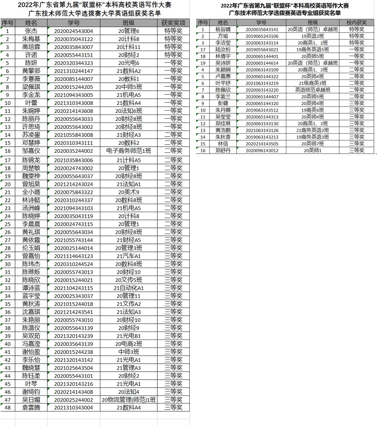 根据《广东省第九届“联盟杯”本科高校英语写作大赛章程》,经过校内初赛的评阅、选拔,现将Beat365官网选拔获奖名单给予公布。按照官方竞赛文件奖项设置的比例要求,评奖分为英语专业组和大学英语组,奖项设置特等奖和一、二、三等奖。现予以公示。