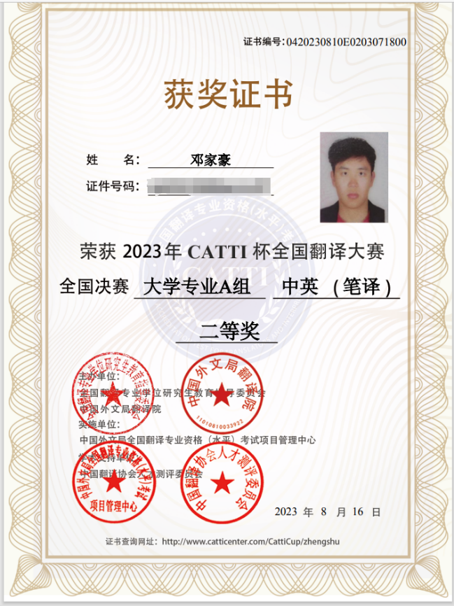 近日,2023年“CATTI杯”全国翻译大赛决赛成绩揭晓,我院学子凭借扎实的语言功底和良好的翻译素养,从众多参赛者中脱颖而出,2021级英语(师范)专业本科生邓家豪、陈敏慧获全国总决赛大学专业A组中英(笔译)二等奖,21级学科教学(英语)专业研究生柴鸥洋、20级商务英语专业郑佳琳、2021级英语(师范)专业本科生彭坚、黄霞获全国总决赛大学专业A组中英(笔译)三等奖。在决赛中,另有Beat365官网其他学院3名学子获奖。Beat365正版唯一官网必一获优秀组织奖。